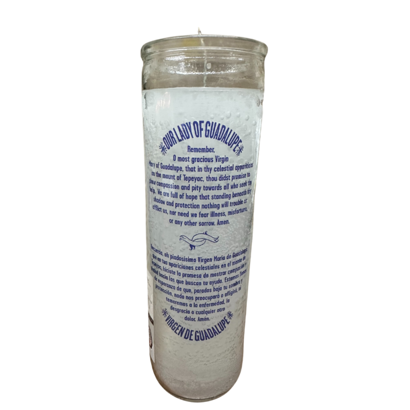 Light up the tranquil ambiance of our 7-Day Our Lady of Guadalupe (Virgen de Guadalupe) candle, an homage to the cherished patron saint of Mexico, an emblem of faith and devotion for countless believers. Crafted with reverence, this candle embodies the divine elegance and boundless mercy that the Virgen de Guadalupe represents. When lit, its flame becomes a luminous guide, inviting not only the warmth of a physical glow but also the spiritual warmth of unity, tenderness, and serenity into every nook and cranny of your living space. Delve into the rich history and unwavering spirit of the Virgen de Guadalupe, letting her benevolent energy permeate your surroundings. As the days go by and the candle continues its burn, envision your home transformed—a haven where the walls echo with tales of miracles, the rooms breathe comfort, and every corner radiates with divine love and spiritual harmony. Comes with the prayer in English and Spanish on the back.